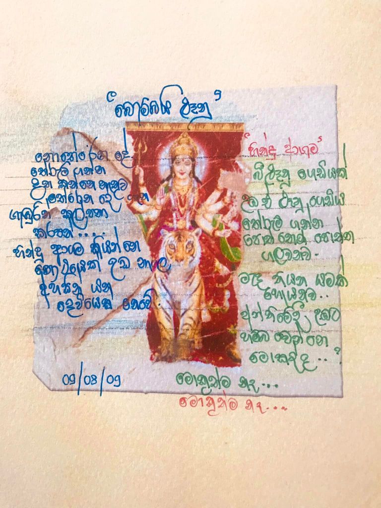 මේ දෙබස ඇතිවුනේ ජායිපූර් නගරයේදී දැනට අවුරුදු දොලහකට දහතුනකට කලින්. මාස කීපයයක් ඇතුලත හින්දු සමාජය තේරුම් ගන්න උත්සාහ කරපු තරුණයෙක් කොයි තරම් ලැජ්ජ වුනාද.. අපේක්ශාභංගත්වයකට පත්වුනාද… ගැඹුරු අදහසක් තේරුම් ගත්තද කියන්න දන්නෙ නෑ.නමුත් ඒ හැම එකකම එකතුවක් වෙන්න ඕනෙ.ඒ දවස්වල වැඩිපුරම කරේ සටහන් පොතේ පොඩි පිංතූර අඳින එකත් ..රූප කොල කෑලි අලවමින් හිතෙන දේ ලියන එකත් ඇර,දකින හැමදේම හිතේ ඇඳගන්න එක විතරයි.අද ඒ සටහන් පොත ආපහු දිග අරින්න හිතුවෙ හින්දු ආගම ගැන සරල ලියවිල්ලක් ලියමින් ඉන්න නිසා.